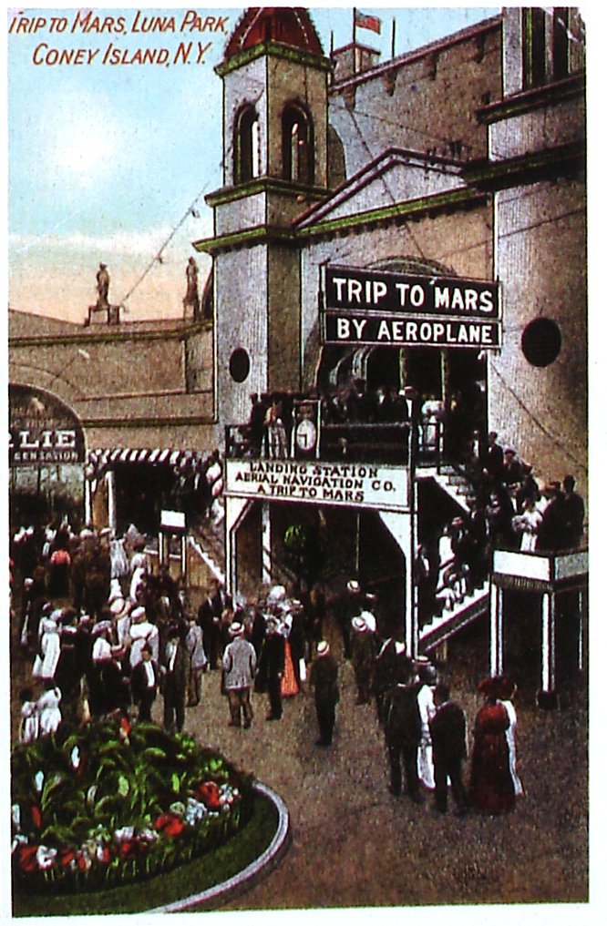 Luna Park Trip To Mars by Aeroplane in Coney Island. They got this idea from a ride that was showing at the Chicago World's Fair. When people would go inside in the dark, they had pictures of Mars on rollers in front of them, and had scenes of Mars, take off, landing, and the trip through space.